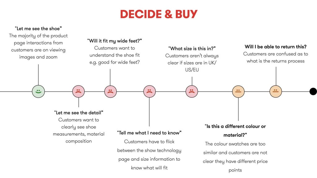 In terms of focus, Fitflop had been very much on a sales and acquisition footing. They lacked the experience and resources to research and understand the experience for users or how to design digital journeys. The digital team and broader business had very little exposure to User Experience Design as a practice. The team also lacked experience in digital development and what that looks like when embarking on a website redesign.