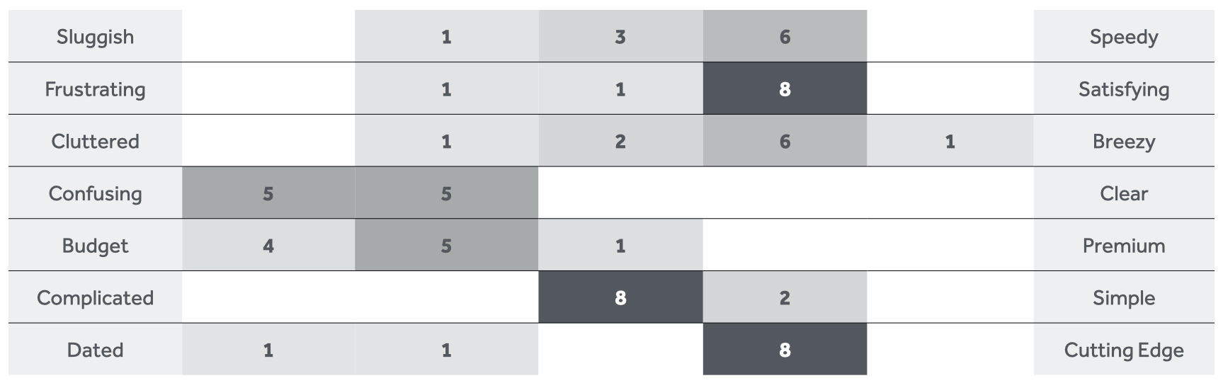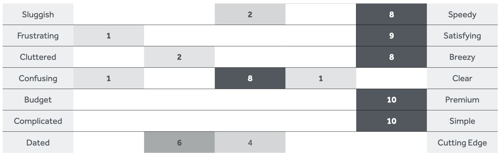 A great tool to measure and quantify emotion (that UX researcher James Chapman introduced to me at John Lewis) is the Bipolar Emotional Response Technique (BERT). It works by asking users to rate their level of emotional response by comparing two adjectives together.